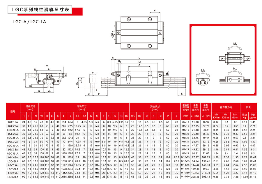 LG 系列线性滑轨,为四列式单圆弧牙型接触线性滑轨,同时整合最佳化结构设计的超重负荷精密线性滑轨,相较于其他之线性滑轨提升了负荷与刚性能力;具备四方向等负载特色、及自动调心的功能,可吸收安装面的装配误差,得到高精度的诉求。高速度、高负荷、高刚性与高精度化概念已成为未来全世界工业产品发展的趋势,Mackwin 四列式超重负荷线性滑轨,即为基于此理念开发的产品。